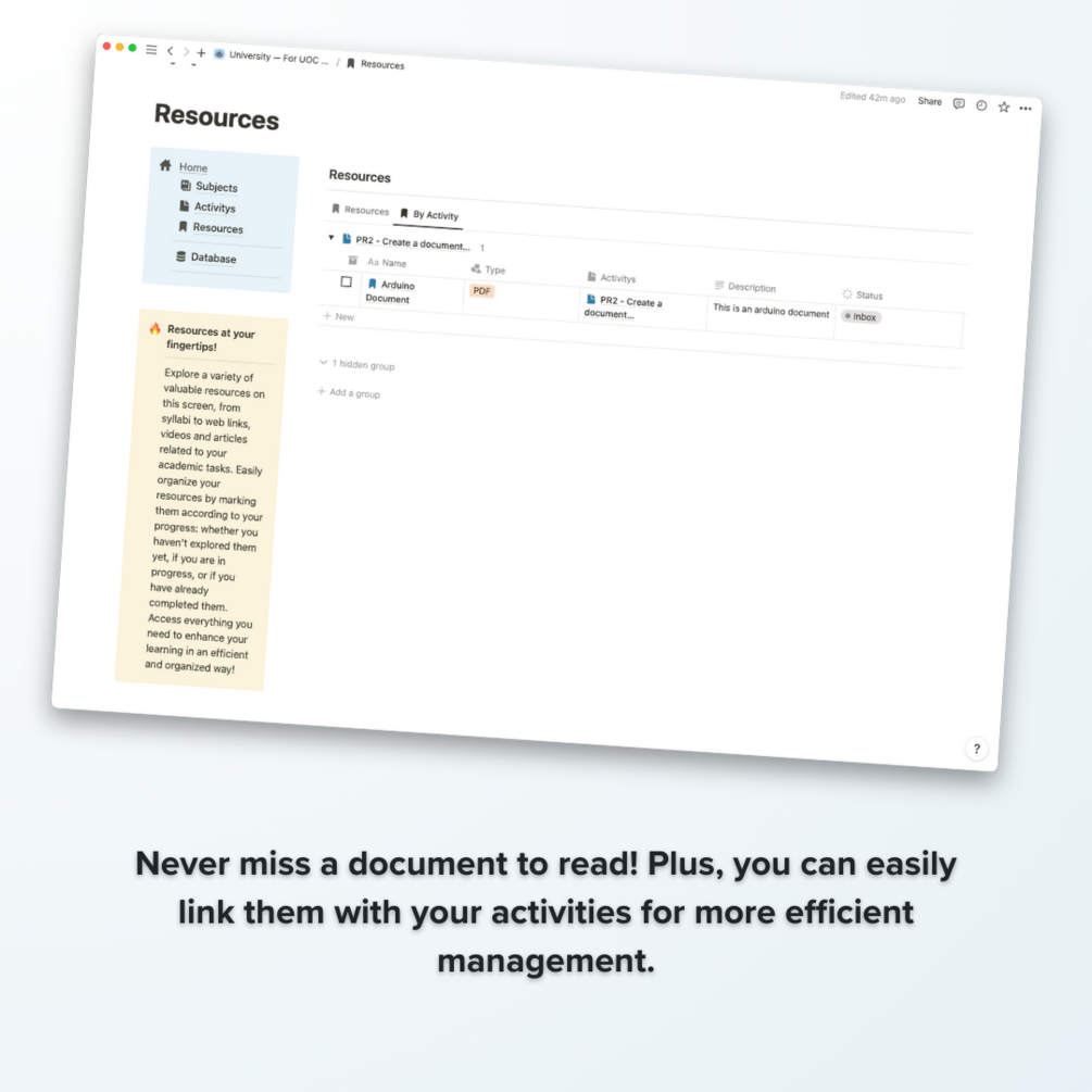 - Resources: At this level, you can keep track of all useful resources for your studies. Each resource is associated with an activity and contains details such as resource description, resource type (article, course, image, PDF, podcast, etc.), read status, and URL.